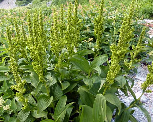 | バイケイソウ 【梅尅吹z ユリ科 シュロソウ属 学名:Veratrum album subsp. oxysepalum 中部地方以北の本州・北海道、樺太・千島・朝鮮・中国・ウスリー・カムチャッカなどに生育し、茎は太く、直立し、高さ1〜1.5mの多年草。