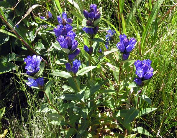 花は青紫 季節は9月〜10月 低地、山地の草原で見かける。草高80cm前後。花径3cm。葉が細い。 北海道が中心だが、本州の高山帯にも生息する多年草。花は、普通のリンドウより淡いムラサキ色。