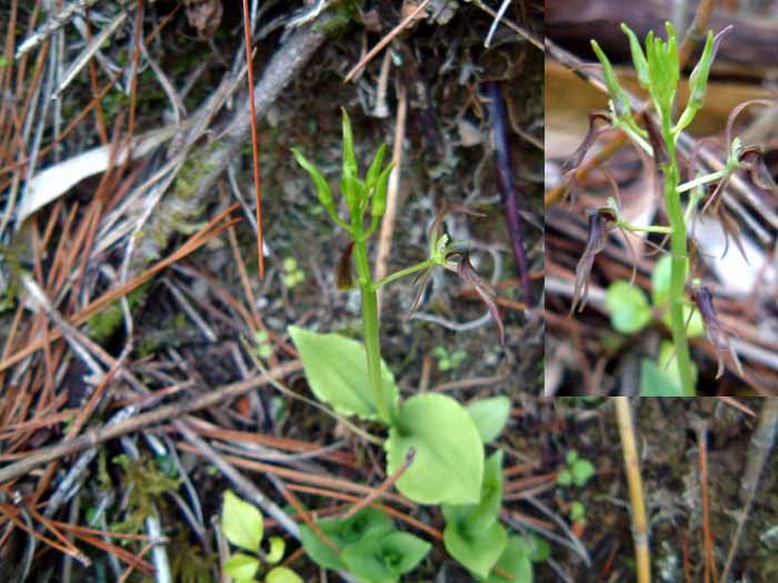 | ジガバチソウ 【似我蜂草】 ラン科クモキリソウ属 学名:Liparis krameri 北海道から九州、朝鮮に分布する草丈8〜20cmの多年草。アカマツ林やコナラ林などの二次林に時折成育するランであり、どちらかといえば尾根筋などの落葉量が少なく、安定した立地に生育する。