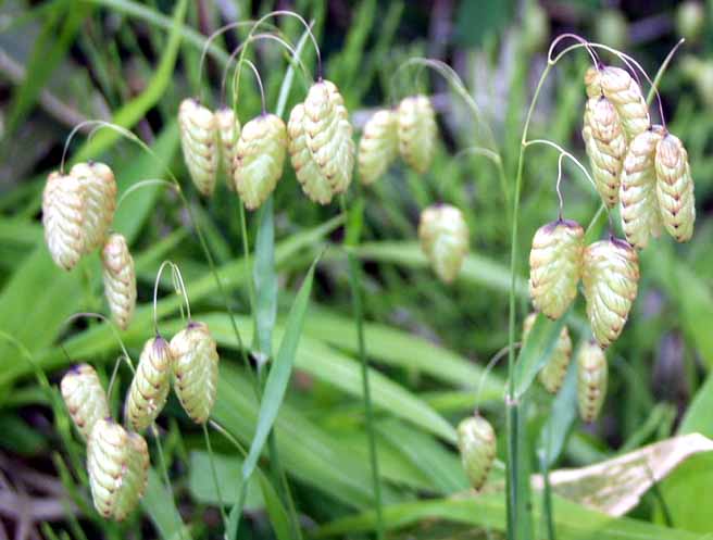 別名:タワラムギ(俵麦) 花期:5〜7月。ヨーロッパ原産で、明治時代に渡来した一年草。 元々観賞用として輸入されたものが野生化し砂地や海岸などで群落が見られる。 全体の高さは30〜70cmくらいになり、釣り糸のような細い柄の先に多いものでは20個くらいの小穂をつける。 最初は淡い緑色ですが、やがて茶色へと変化してゆく。 小判の形をしているところから「小判草」。でも俵の形をした麦に似ているので「俵麦(タワラムギ)」とも言う。