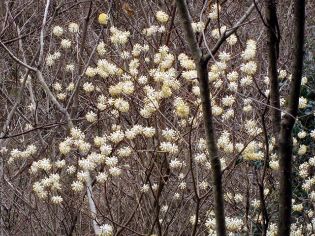 花期:春。 落葉低木。和紙の原料とされるコウゾ・ミツマタのミツマタ。 桜の季節に花をつけ、花がない時期には,文字どおり枝が三つ又に分かれているので容易に識別できる。 園芸品種として花の先が赤いものなどもある。