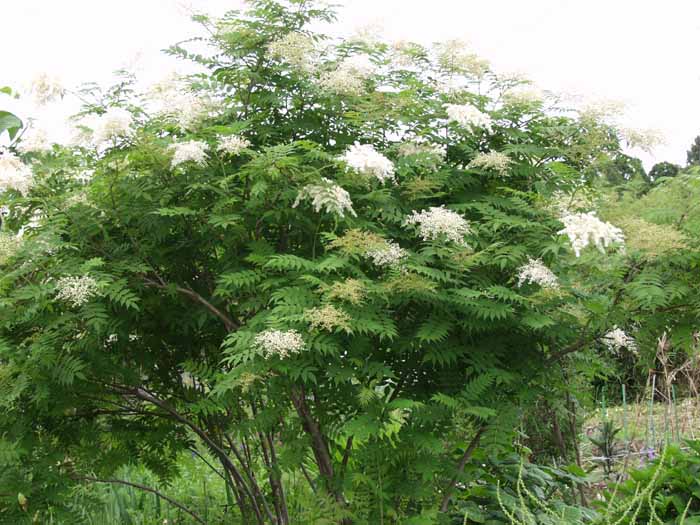 山地帯〜亜高山帯の林内に生える高さ7〜10mの落葉高木。 灰色を帯びた暗褐色の樹皮をもつが、枝は濃紫紅色で全体に毛がない。 7回も竈に入れても焼け残るという程、材が燃えにくいので付いた名前。 枝先に複散房花序をだして、白い小さな花を沢山咲かせる。花弁は5個で内側に毛があり、雄しべは20個。 梨実は球形で赤く熟し、垂れ下がってつく。 表面は緑色で裏面の色が淡い葉は、披針形〜挟卵状長楕円形の奇数羽状複葉で、小葉は5〜7対あって、先は鋭く尖り、頂小葉以外は無柄。