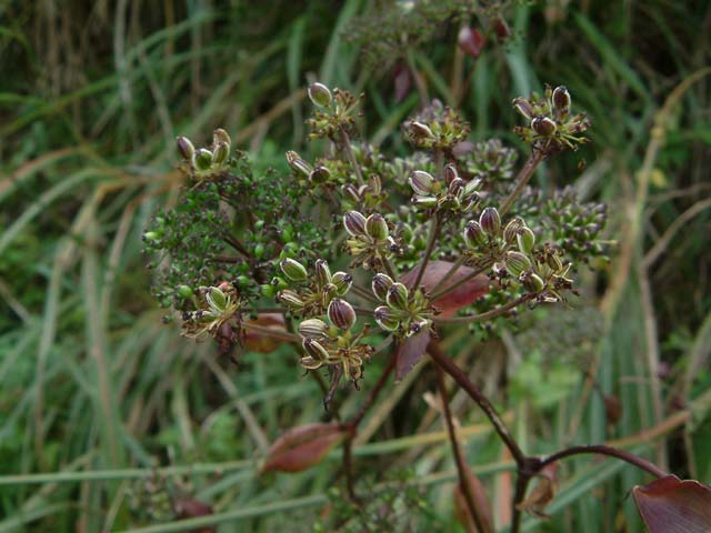 本州(関東地方以西)、四国、九州に分布し、山野の日当たりのよい人里・田畑,山地・低山,原野・草原に生える草丈1mほどの多年草。 8〜11月に花が茎の先の複散形花序につき、白花の多いセリ科の中では、花や茎が紫褐色になるのが特徴。茎の上部に付く葉は柄がふくらんで鞘状になる。 葉は3出複葉で小葉は3深裂〜全裂する。