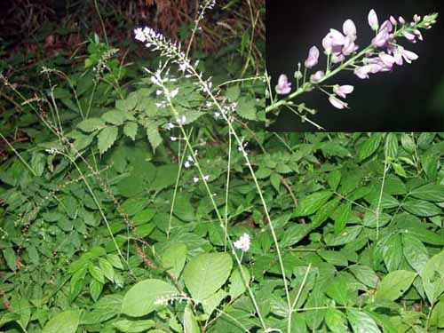 各地の山野の林下にはえる多年草。 高さ30〜90cm、根は硬く木質。 葉はまばらに互生、3出複葉で小葉は長卵形。花は夏から初秋、淡紅色か白色の蝶形花をまばらにつける。 豆果は2節あり、かぎ状の毛によって衣服などにつく。ヌスビトハギにしてみれば、種子を散布するための手段ですが、人には嫌われる。 和名盗人萩(ぬすびとはぎ)は泥棒が侵入するとき足音をたてないように歩く足跡に、豆果の形が似ているためという。