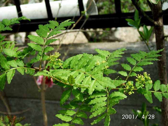 葉は、奇数羽状複葉が互生する。全体は10〜15cmほどで、5〜9対の小葉がある。小葉は1〜2cmの楕円形で縁は鋸歯状。裏は表に比べ白っぽい。