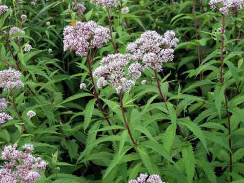晩夏、茎頂に大きな散房花序を出し、淡紅色または白色の小さな頭状花を多数密生する。